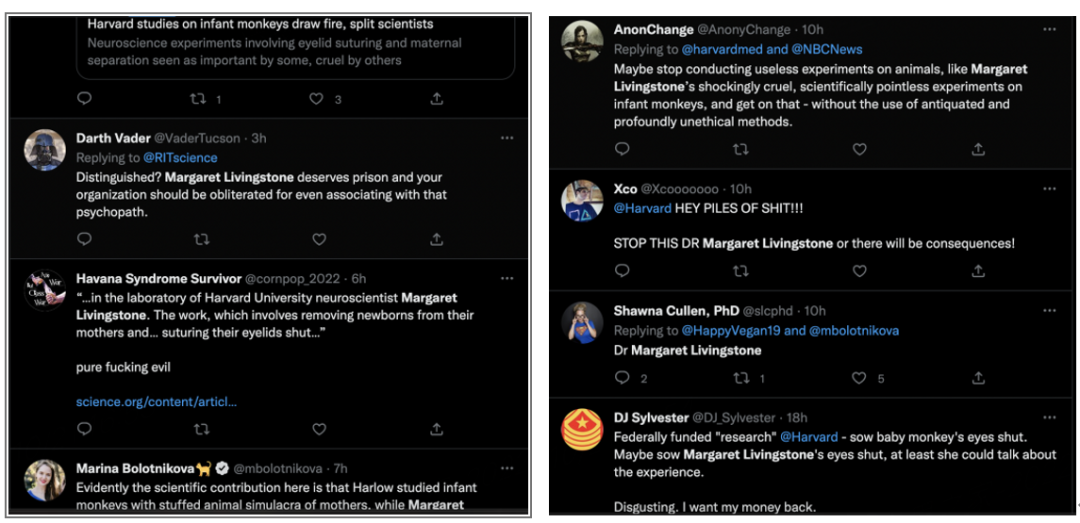 但利文斯通遭遇的麻烦远不止如此,善待动物组织(PETA)也介入了该事件,发起了一项针对性的社交媒体活动,将研究中的“母子分离”和“眼睑缝合”称之为“直接来自恐怖电影”,这也导致了一系列针对利文斯通的公众舆论,甚至网络暴力。