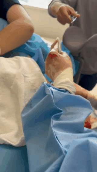生孩子这场面,饶是我一个见过大场面的外科医生,也觉得有点血腥不堪。伴随着一阵一阵的宫缩,和助产士余音绕梁、响彻病房的“1!2!3!···10!”,一颗灰溜溜的大脑袋越来越出来了。