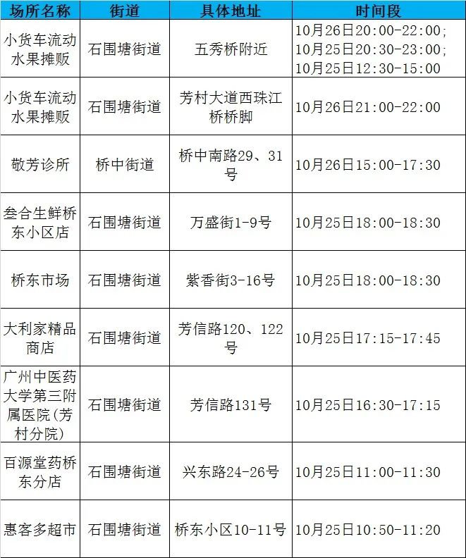 广州荔湾疾控10月27日晚消息,因疫情防控需要,请在相关时段到过荔湾区下述重点场所的人员,立即向所在社区联系报备,开展“三天三检”自我健康监测,期间非必要不外出、不聚集、不聚餐、不乘坐公共交通工具,同时按照社区和疾控部门的要求配合做好健康管理。重点场所名单后续将按实际情况更新。