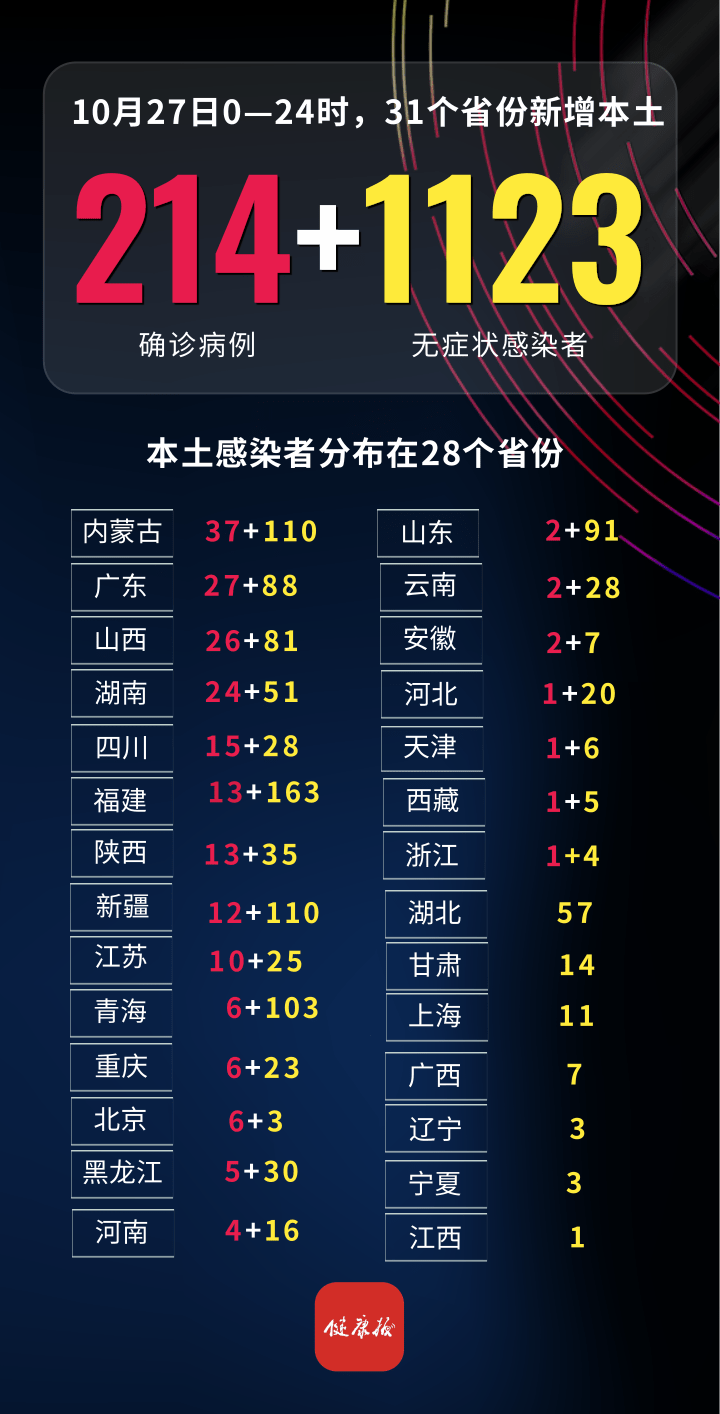 10月27日0-24时,全省新增本土确诊病例27例(广州19例,深圳2例,佛山3例,江门1例,阳江1例,茂名1例);新增本土无症状感染者88例(广州46例,佛山29例,梅州10例,中山1例,江门1例,揭阳1例)。
