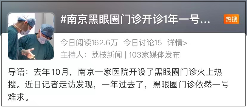 近日,黑眼圈门诊又双叒叕登上热搜了。这一次话题是#南京黑眼圈门诊开诊1年一号难求# 。
