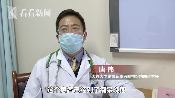 大连大学附属新华医院神经内四科主任唐伟表示:“一定要早期治疗,如果进入到中晚期,它造成的损害是不可逆的,预后也很差。这个患者已经到了痴呆晚期,与人没法交流,日常生活能力已经丧失了,语言能力包括生活自理能力都在下降,所以这个患者如果现在治疗的话,症状能改善,但是是无法治愈的,可以延长寿命,但是无法根治,因为他错过了早期的治疗时机。”