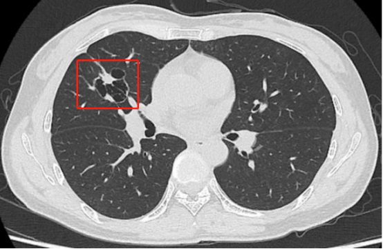 对于这种薄壁囊腔,有些医生可能会认为肺大疱之类的病;但仔细看它的壁,和肺大疱还是不一样的,壁逐渐加厚且外围伴有实质性的结节,这种结节可能就是癌变的组织,看起来就更像少见囊性肺癌了。