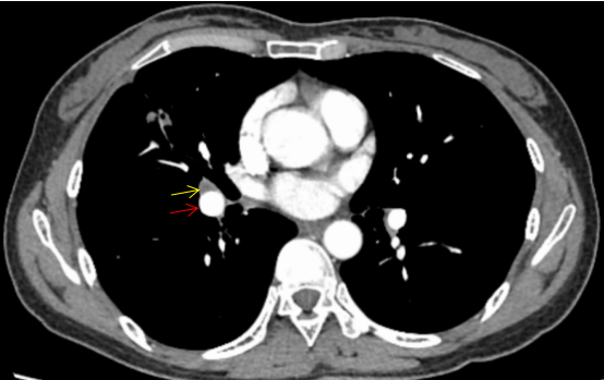 图说:黄色箭头处为淋巴结;红色箭头处为肺门动脉