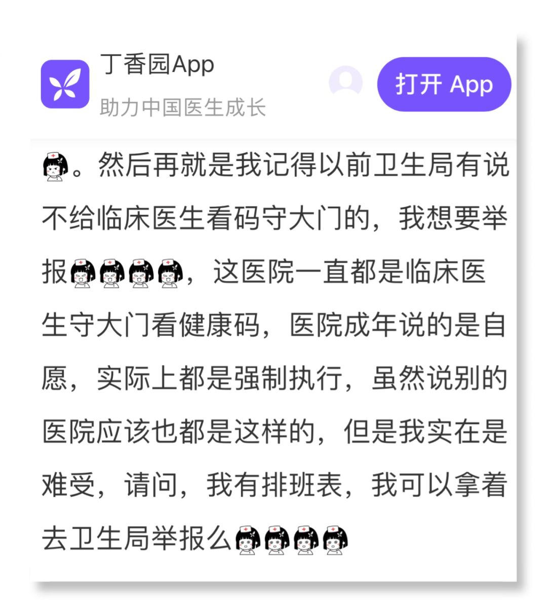 一位网名@小夏是大腿毛的某大三甲急诊科医生,在丁香园发帖举报:我记得以前卫生局有说不给临床医生看码守大门的,我想要举报医院一直都是临床医生守大门看健康码。请问,我有排班表,我可以拿着去卫生局举报么?