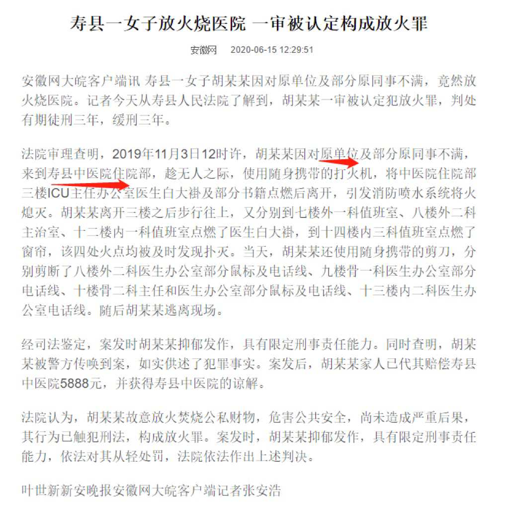 所幸这些火点均被及时发现扑灭。经司法鉴定,案发时这位女医生系抑郁发作,具有限定刑事责任能力。到案后如实供述了犯罪事实。家人亦代其对医院作出了赔偿,并获得了医院的谅解。