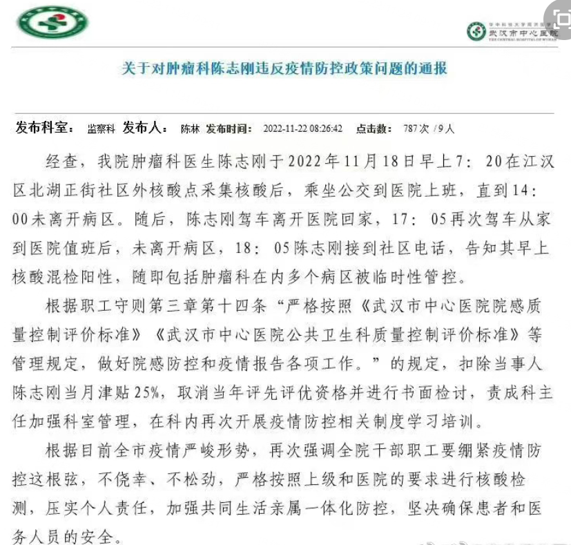 近日,武汉市中心医院发布《关于对肿瘤科陈志刚违反疫情防控政策问题的通报》,因为在院外做核酸混采出现了阳性,导致包括肿瘤科在内多个病区被临时管控,医院扣除了陈志刚当月津贴的25%,取消当年评先评优资格并要求进行书面检讨,同时责成科主任加强科室管理,在科内再次开展疫情防控相关制度学习培训。