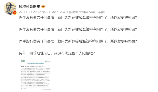 这则处罚通知在微博上引发了许多医生的不满,医疗博主@风湿科聂医生连发三问,“医生没有做错任何事情,就因为新冠核酸混管检查阳性了,所以就要被处罚?”