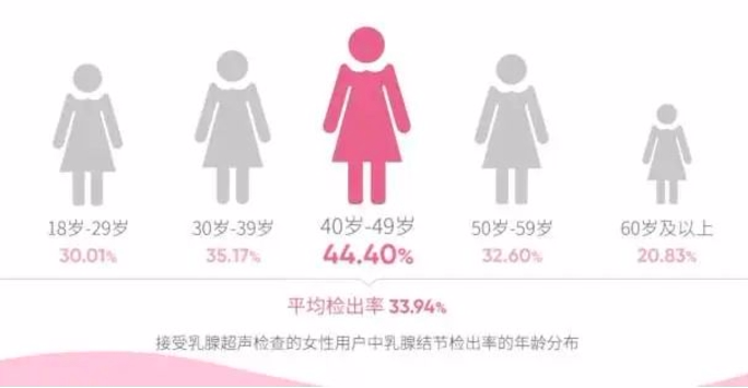 该报告显示,全国乳腺结节的检出率随着年龄的增长,呈现先升后降的趋势,其中40-49岁女性检出率最高,达到44.40%。