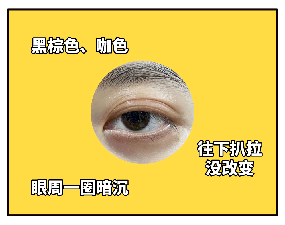 如果你的眼睛下面一圈是黑棕色或者咖啡色,眼眶周围一圈、上眼睑一圈也都有颜色,并且下拉时颜色没有变淡、扩大,那大概率就是色素型黑眼圈。