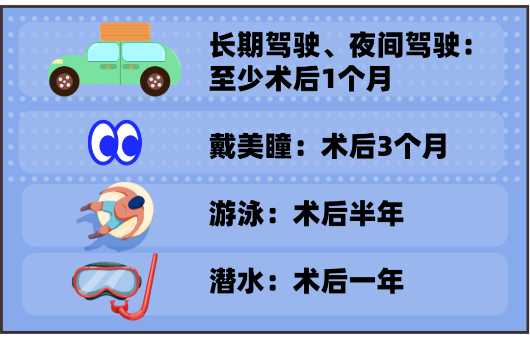术后一个月尽量不要揉眼睛、游泳、化眼妆,如果做的是切口相对明显的半飞秒,最好术后三个月再进行以上行为。