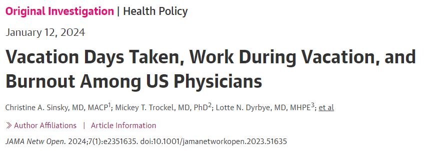 去年,JAMA Network Open发表了一篇题目为“Vacation Days Taken, Work During Vacation, and Burnout Among US Physicians”的横断面研究,主要涉及医生的休假问题。