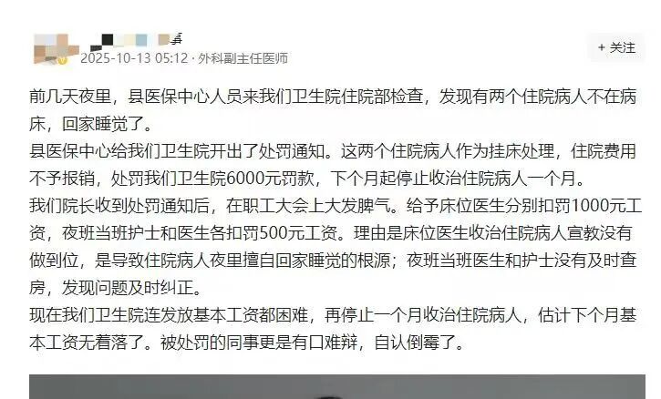 10月13日,江苏某医院一名副主任医师发文提醒:“前几天夜里,县医保中心人员来我们卫生院住院部检查,发现有两个住院病人不在病床,回家睡觉了。县医保中心给我们卫生院开出了处罚通知:这两个住院病人作为挂床处理,住院费用不予报销,另外再对该卫生院进行6000元罚款,下个月起,停止收治住院病人一个月。”