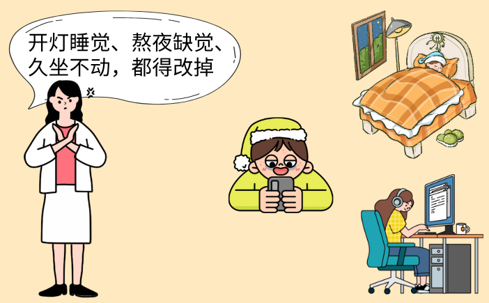 预防建议:睡前关灯,可以装厚实的窗帘挡住光线,以便拥有好睡眠。