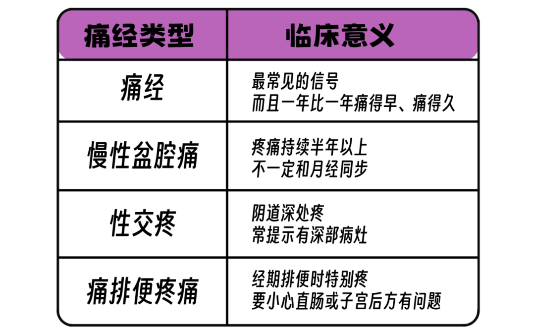 它的症状五花八门,除了痛经,还可能是盆腔痛、同房痛、排便痛、月经量大或不孕。有些人一开始症状不典型,也没想到是妇科问题,结果跑去了消化科、泌尿科,甚至以为是心理压力,兜了一圈才回到妇科。
