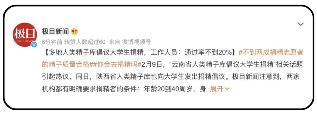 这让我们想起之前多地人类精子库倡导大学生捐精,结果志愿者通过率却不到20% 的新闻。