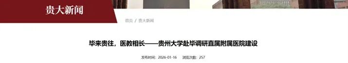该次座谈会传出消息,贵州大学副校长向嵩在总结发言时指出,双方已就直属附属医院建设达成基本共识,下一步将细化实施方案、明确时间节点。