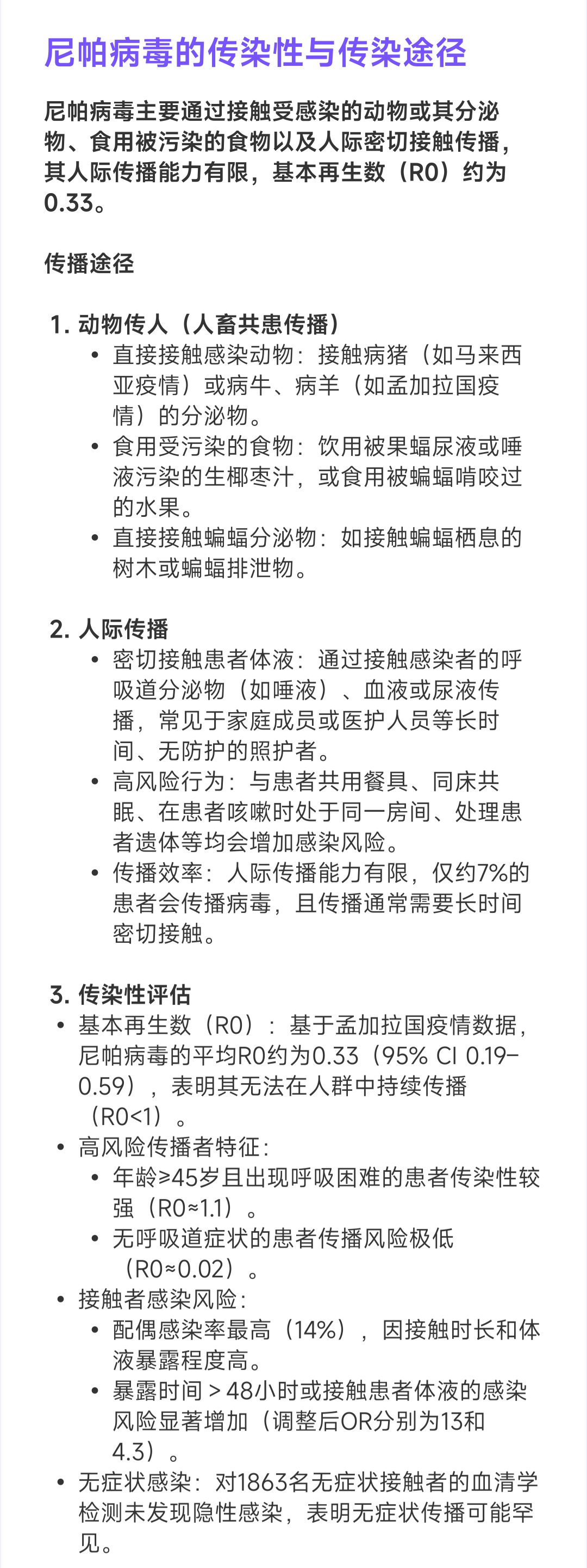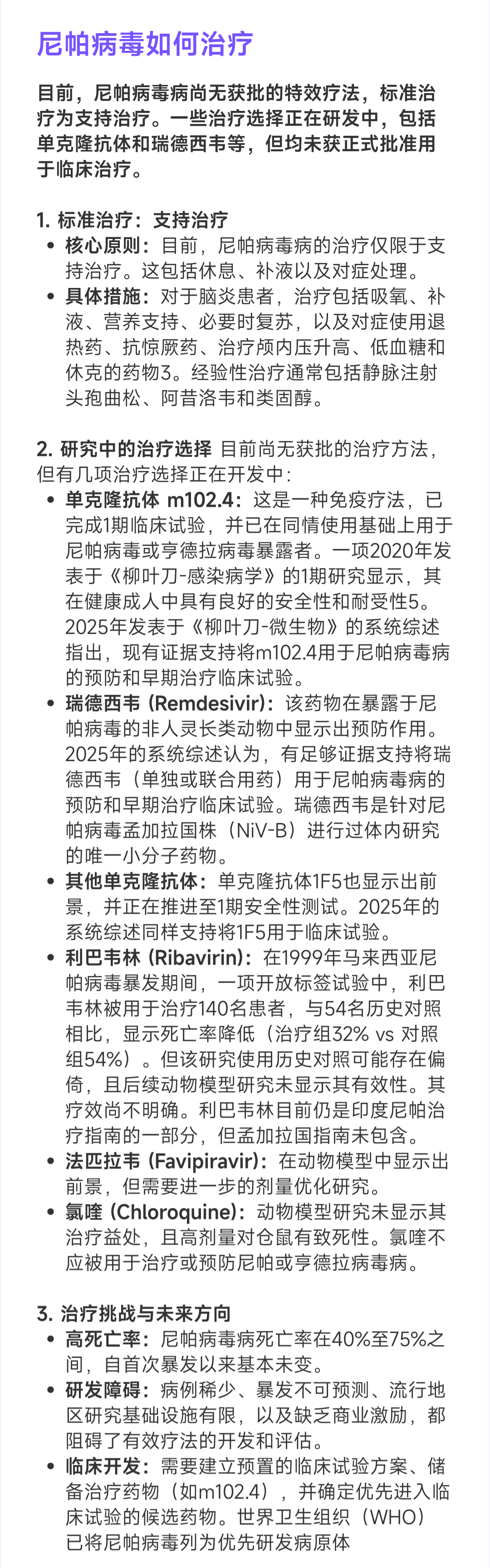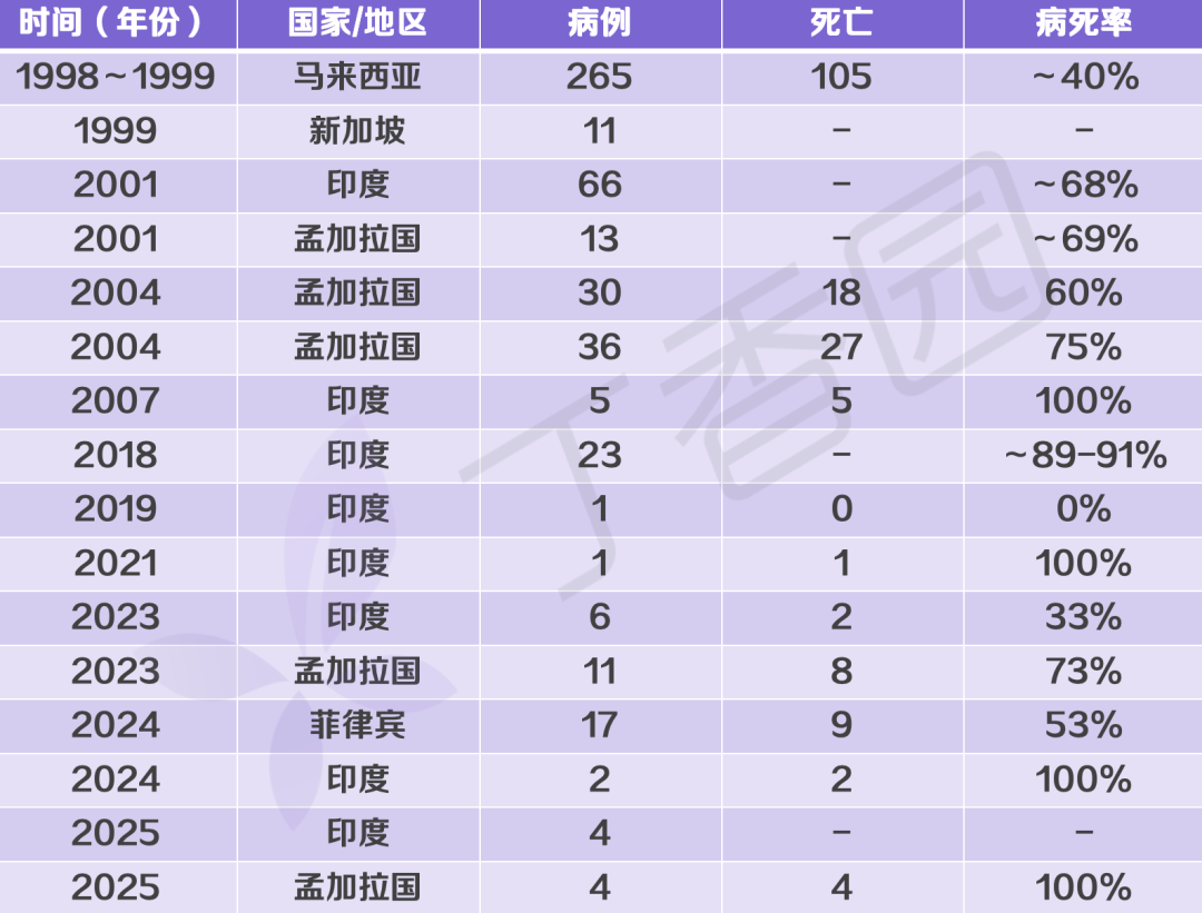 除了这次之外,2021 年和 2024 年的印度、2025 年的孟加拉国,都出现过病死率高达 100% 的小规模暴发。