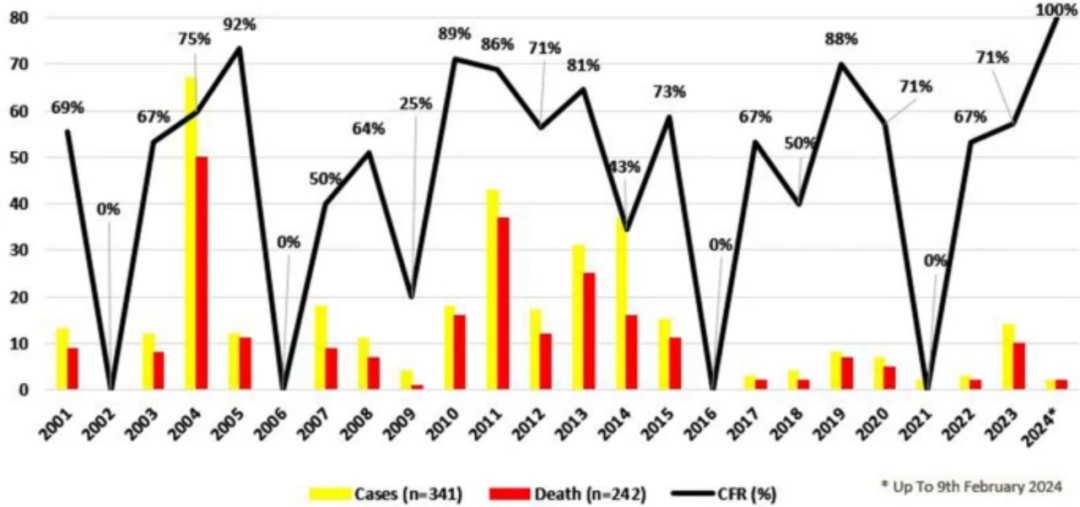 如果从周期来看,基于 2001 年至 2024 年 2 月期间孟加拉国记录的 341 例人类病例数据看,尼帕病毒感染的病死率估计高达 71%。