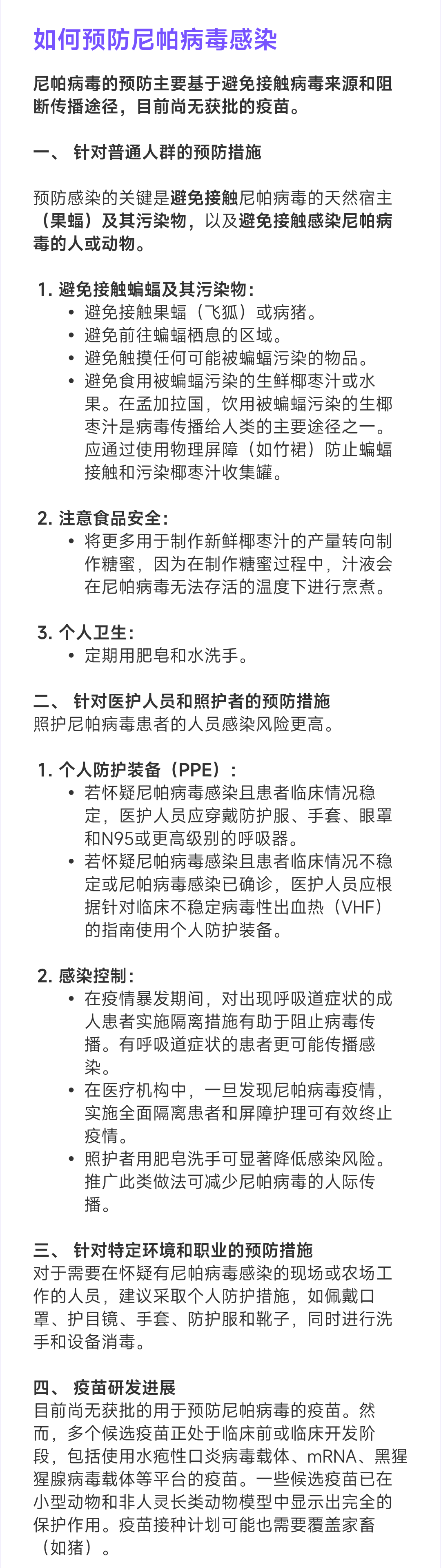 文章开头提到的印度最新暴发的尼帕病毒疫情,就要溯源到一名 56 岁女性患者,于 2025 年 12 月疑似因尼帕病毒感染(发热、意识障碍)去世,其生前所住的医院就是上文提到最初两名感染医护所在的医院。