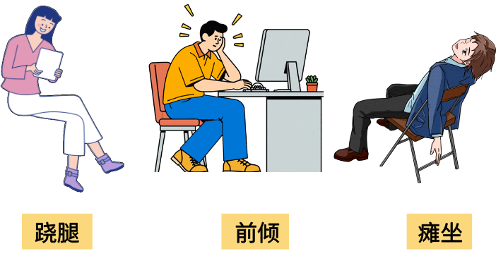 跷二郎腿使骨盆倾斜、腰椎侧弯;身体前倾导致腰椎间盘承受的压力过大;瘫坐使腰部悬空,失去支撑,腰椎间盘后侧被过度牵拉。