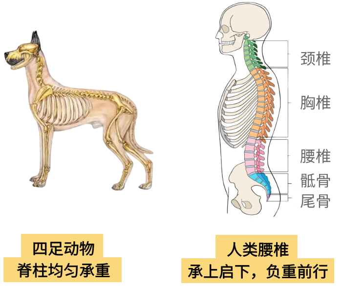 四足动物时,脊柱像一座稳固的拱桥,均匀承重。直立行走时,脊柱变成了垂直的承重柱,腰椎成了承受上半身重量的地基。