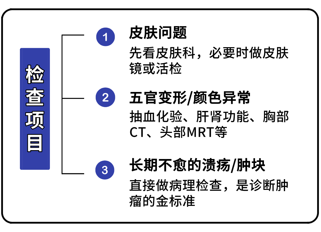 我们可以这样做,如果“有症状出现”“持续2周不好转”“伴有体重骤降(1个月瘦5斤以上)、不明原因乏力”,及时做这些检查: