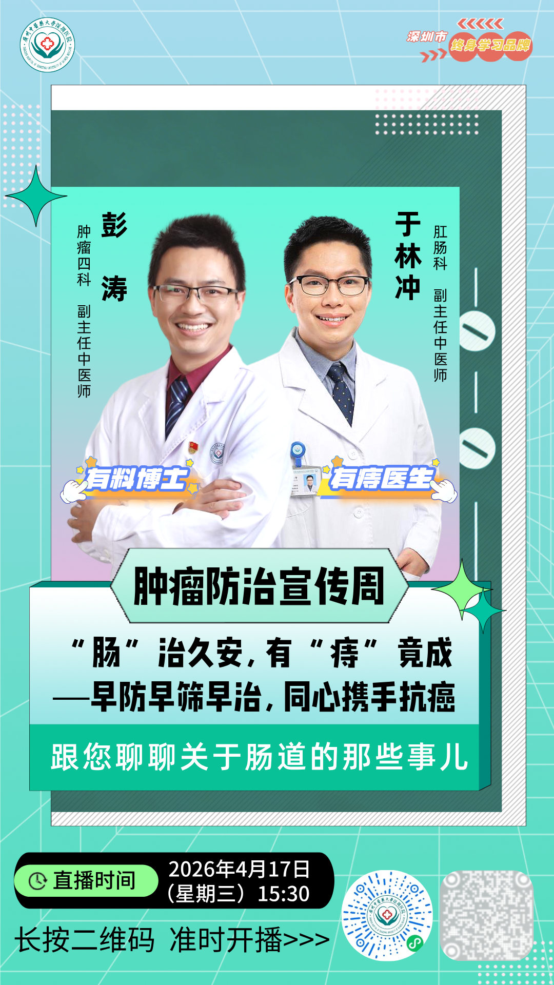 两位专业医师通过深度解析肠癌防治全链条知识,从早期筛查到中西医结合治疗,从康复调理到营养支持,让健康知识突破时空界限直抵千家万户。4月17日15:30,锁定广州中医药大学深圳医院“健康直播间”,“有痔”医生和“有料”博士医生与大家不见不散。