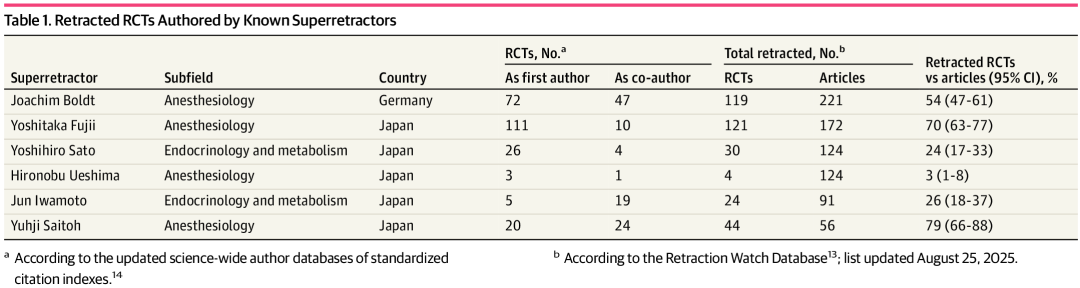 表:知名“造假之王”们撰写的被撤稿RCT概况。/表源:JAMA Network Open