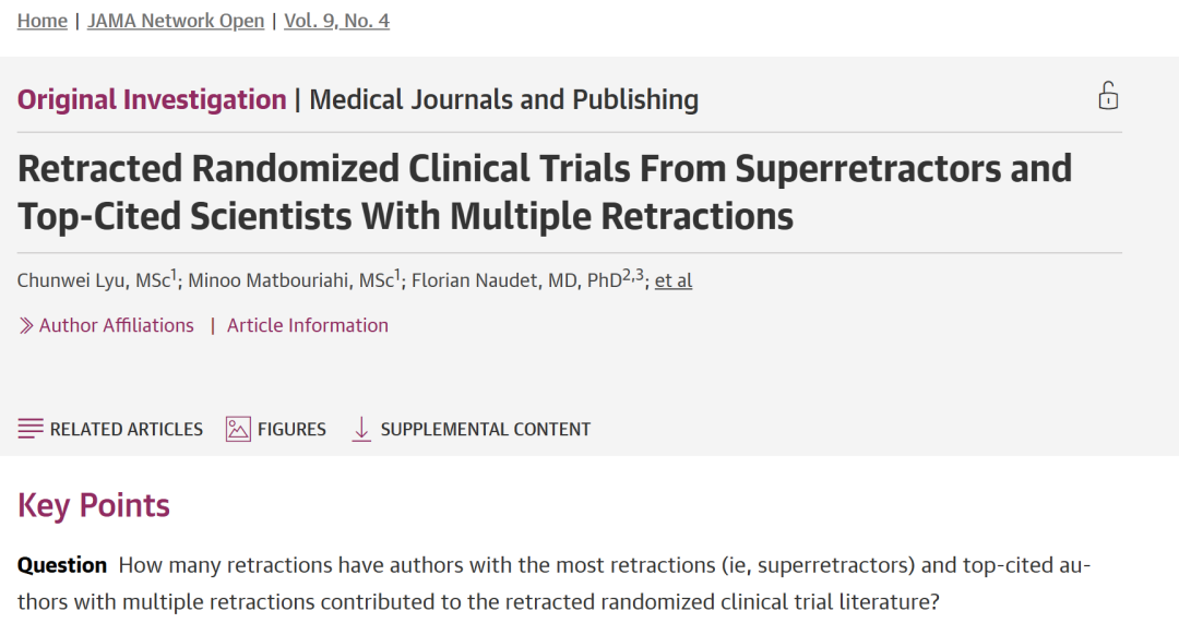 1. Lyu C, et al. Retracted Randomized Clinical Trials From Superretractors and Top-Cited Scientists With Multiple Retractions. JAMA Netw Open. 2026;9(4):e267424.