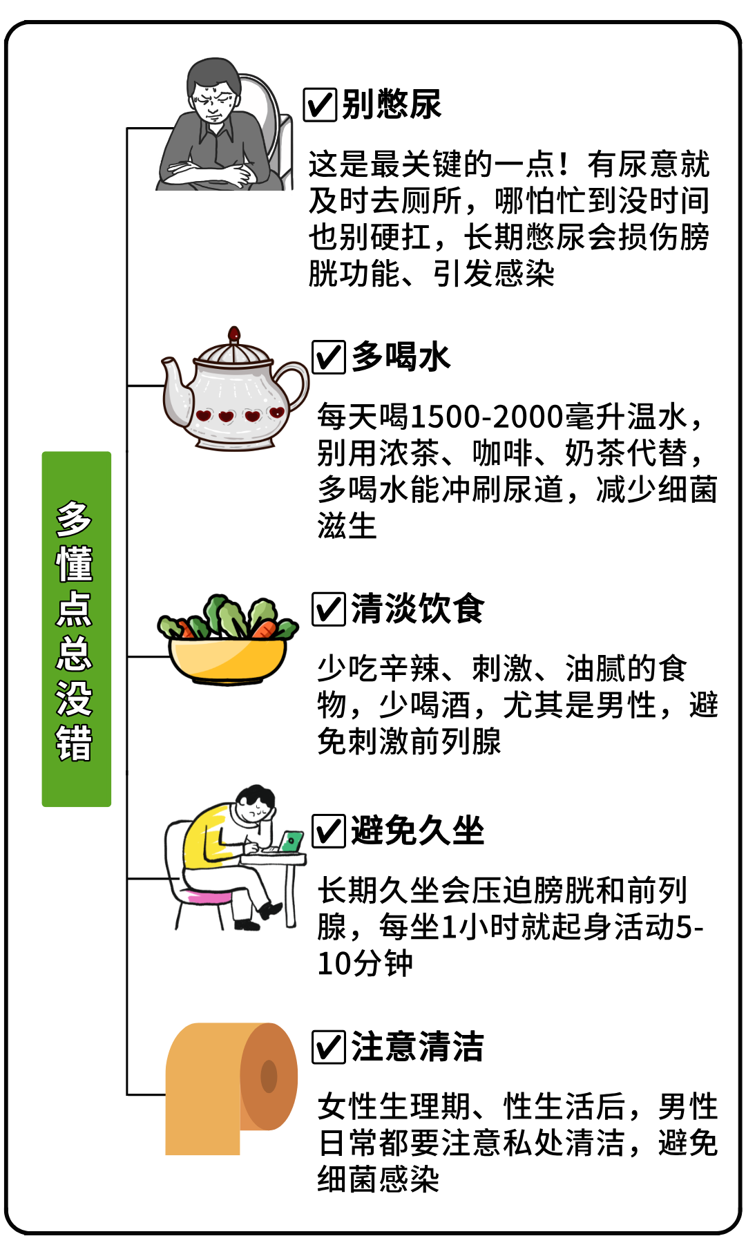 ▶不管有没有症状,日常做好这几点,都能保护膀胱和尿道: