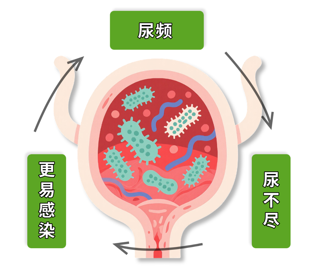 于是形成“尿频-尿不尽-更易感染”的恶性循环,最终甚至影响肾脏健康。