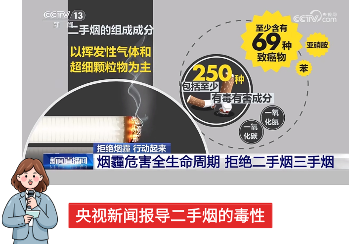 二手烟的组成成分以挥发性气体和超细颗粒物为主,包括至少250种有毒有害成分,其中至少含有69种致癌物