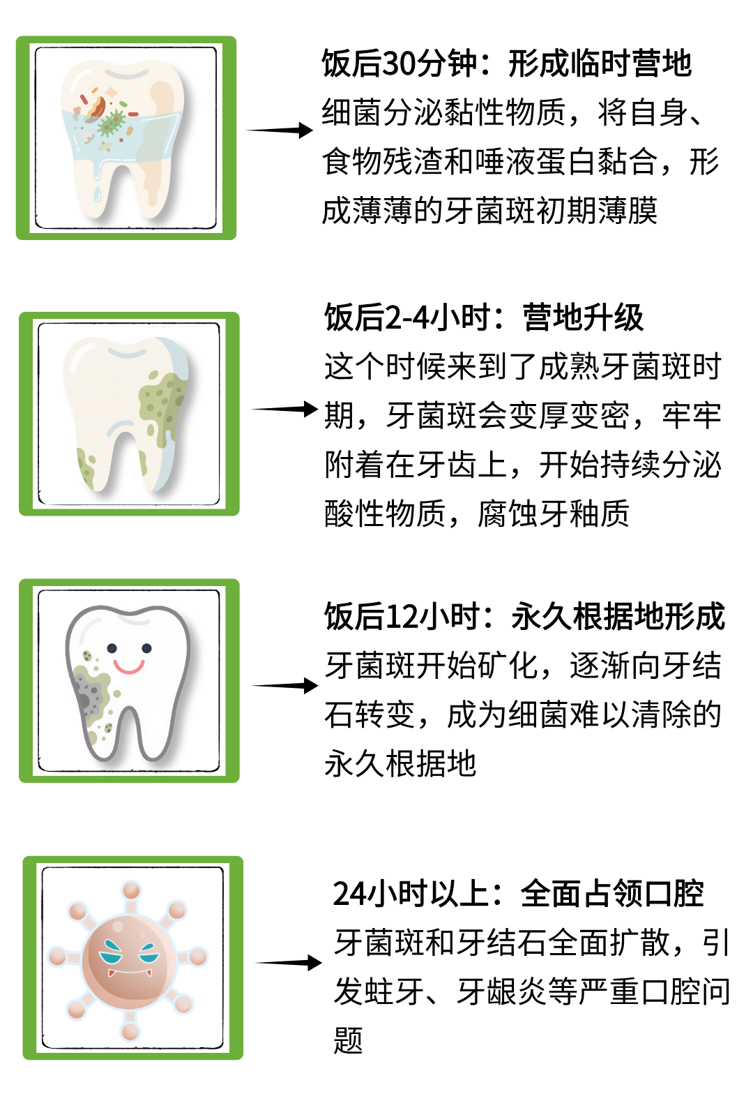 在你吃完饭后,食物残渣带来的细菌会这样一步步在口腔里安营扎寨: