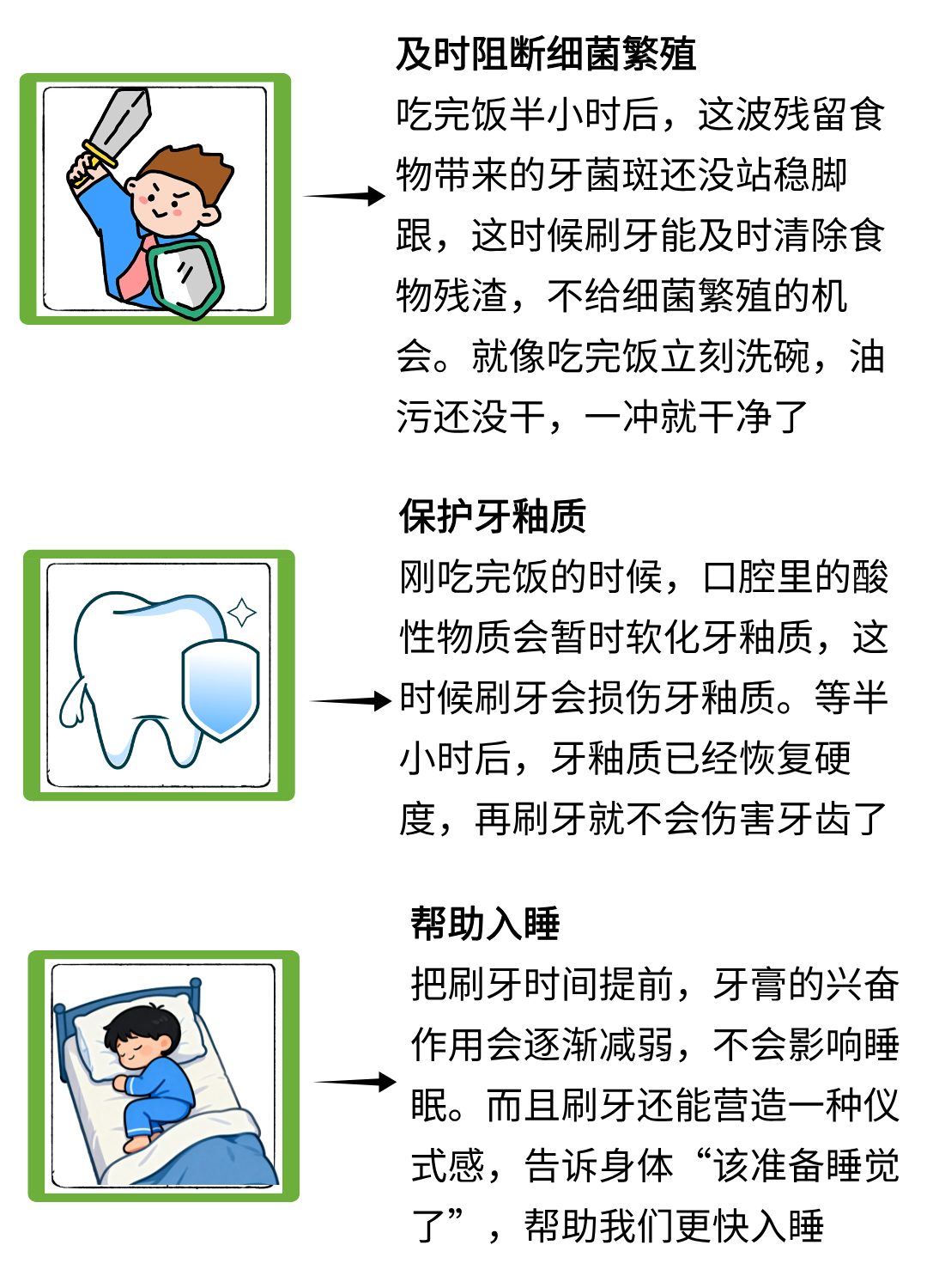 上海交通大学医学院附属第九人民医院口腔外科副主任医师邹多宏提醒,晚饭(30分钟)后刷牙比等到睡前再刷,对口腔健康更好。