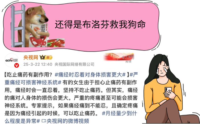实际上,布洛芬是非甾体抗炎药,不是阿片类成瘾性药物,它是通过抑制前列腺素合成来缓解疼痛的。按需服用布洛芬不会成瘾,也不会有伤害子宫、影响生育等所谓的副作用。