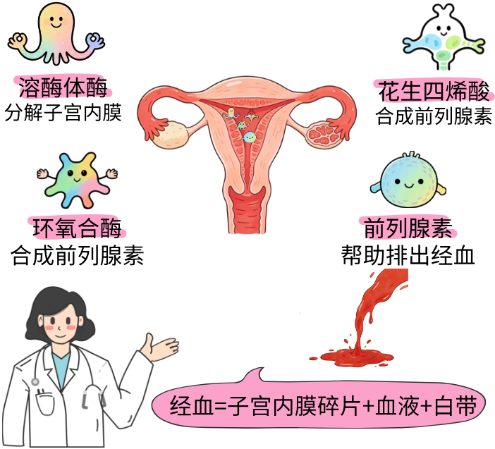 为了让这些脱落的内膜顺利排出,细胞里的溶酶体酶会活跃起来,帮助分解内膜细胞。在这个过程中,细胞内部的花生四烯酸和环氧合酶也会被释放出来,合成前列腺素。