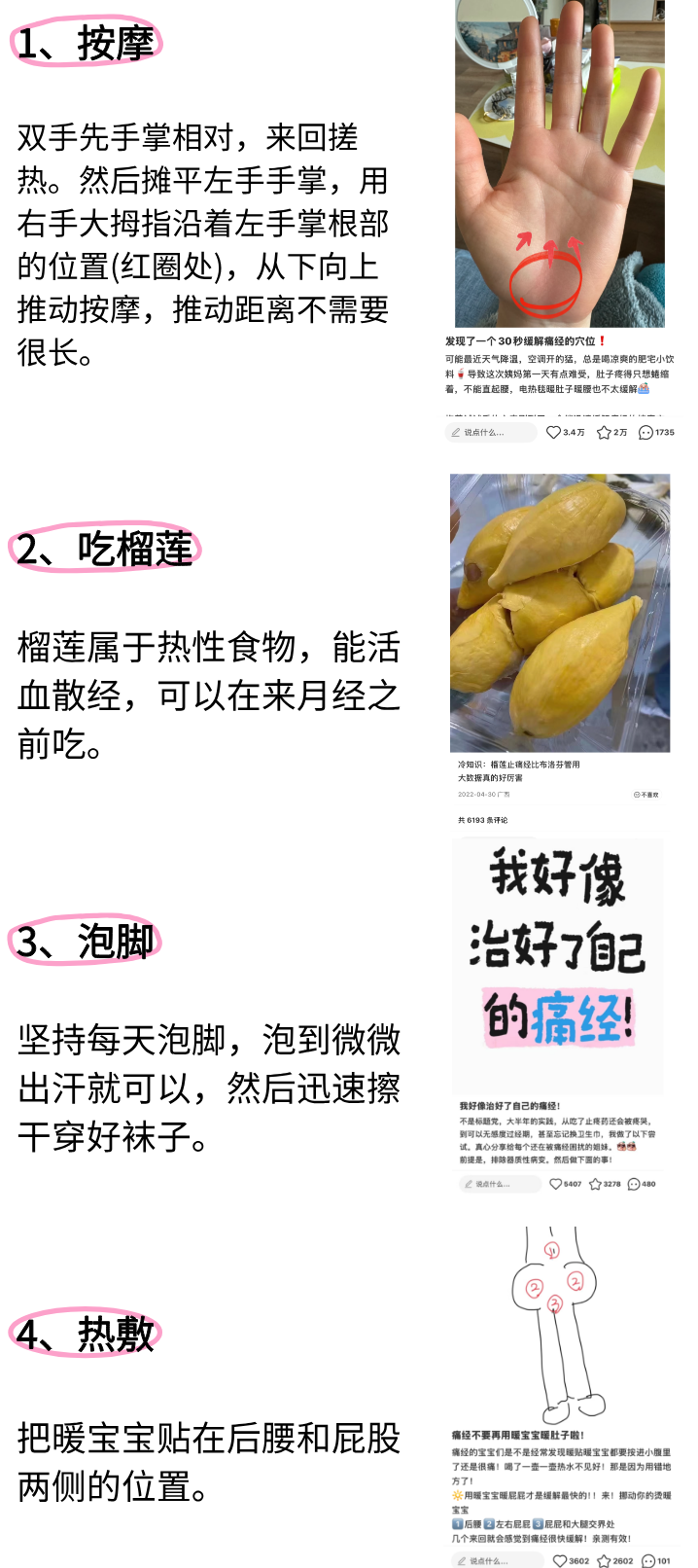 网上有很多女生分享了自己缓解痛经的独门绝招,大家可以试试,效果因人而异。