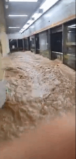 交通系统瘫痪,地铁里呼啸而过的,不再是前进的列车,而是滔滔的洪流。