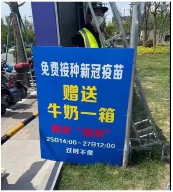 有的社区打疫苗就送牛奶,花生油,鸡蛋,洗衣液。
