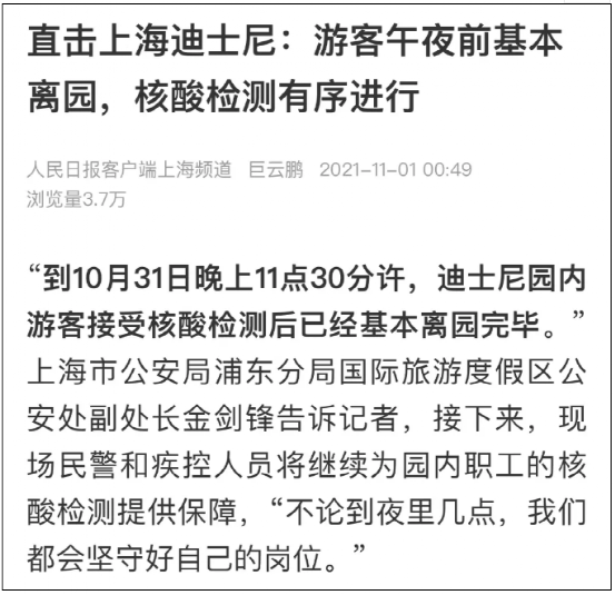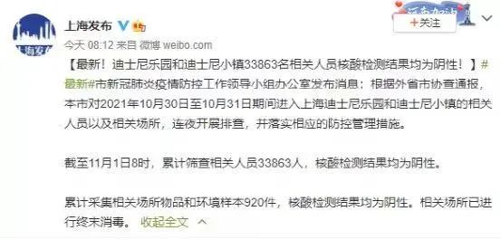 迪士尼乐园和迪士尼小镇33863名相关人员,核酸检测结果均为阴性。