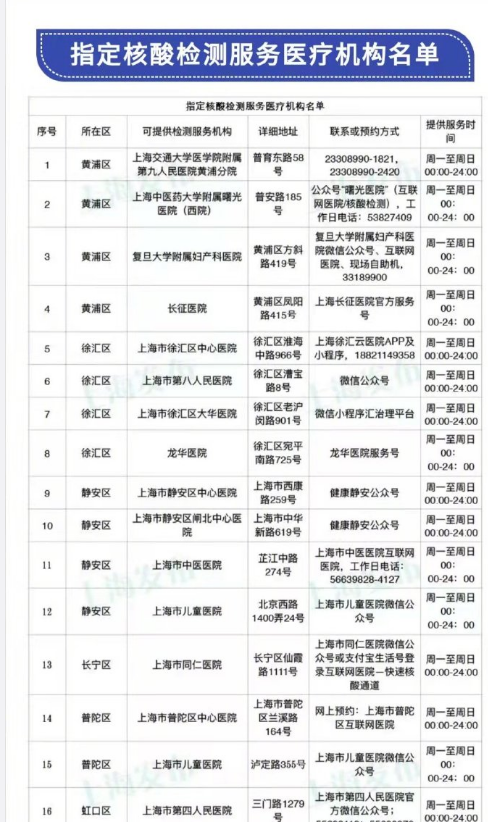 随后,上海市政府新闻办公室官微“上海发布”,公布了本市可24小时核酸检测的医疗机构。