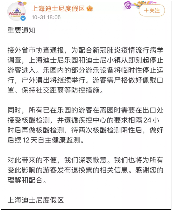 迪士尼发布公告后一个小时,30日和31日的游客,已经纷纷收到学校或者单位发布的通知。