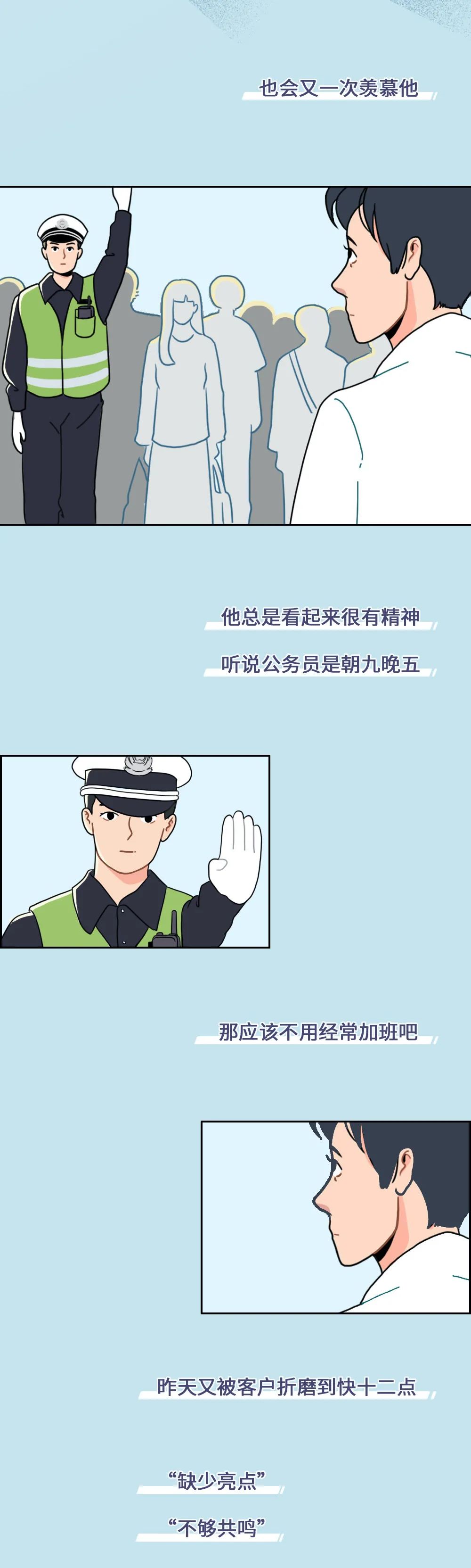 有次被客户折磨到体无完肤望着窗外放空,无意间看到了街对面的交警也在望着大楼,突然好奇体制内的人有没有过向往体制外的时候?就去问了周边的公务员朋友,得到的答案大多都是“当然有过”。