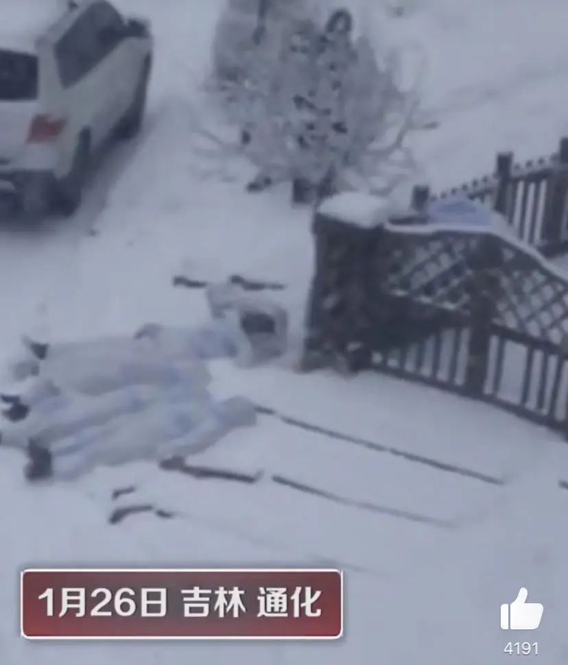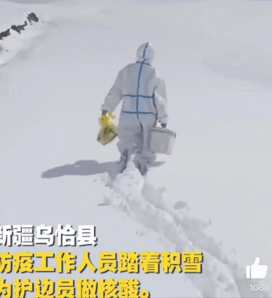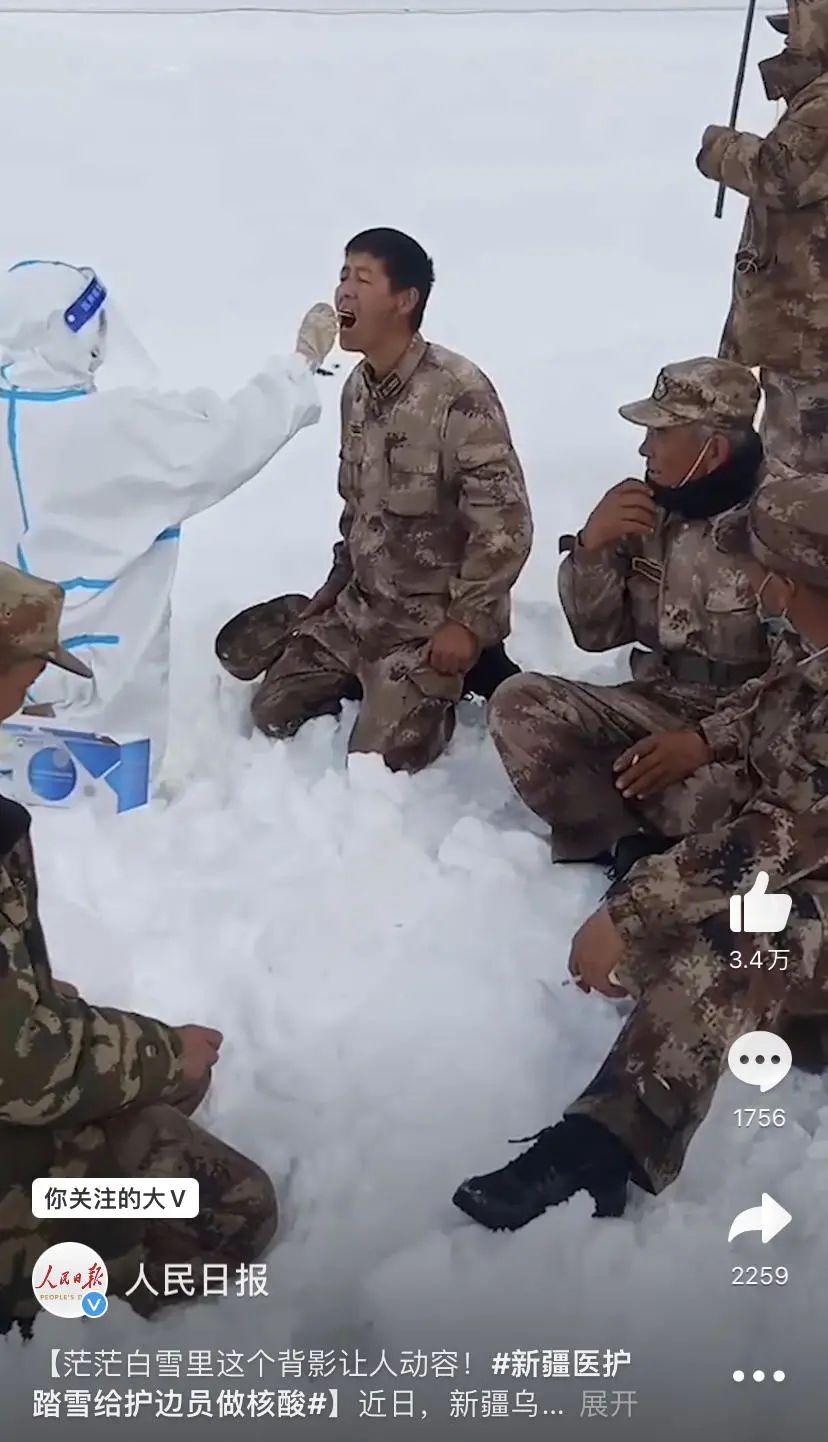 视频的结尾,雪地里护边员围坐成一圈,等待防疫人员取样。