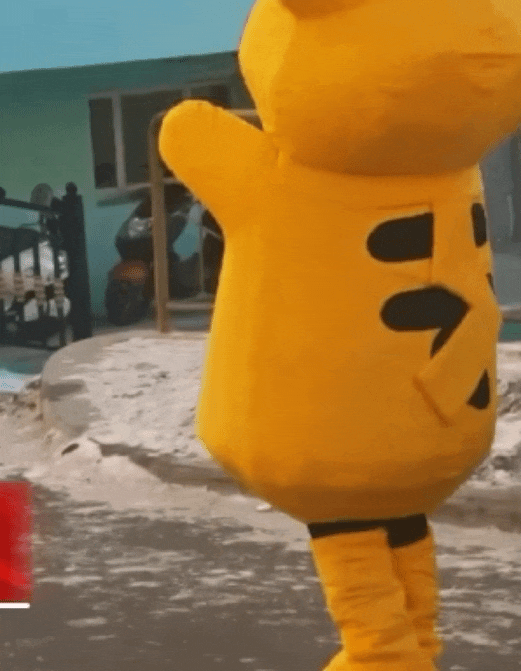 兰女士在玩偶服里露出口罩,然后对着警察蹦蹦跳跳转了一圈,一摇一摆离开了。