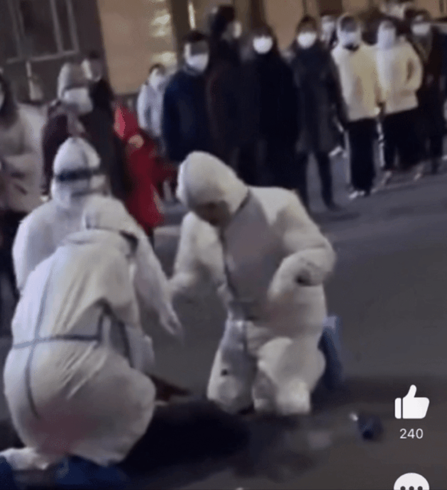 叫120已经来不及了,三个做核酸检测的医护人员冲过来,围在他身边抢救。