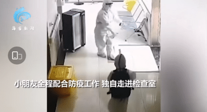 视频里小朋友独自一人穿着防护服,背着大大的包,推着比自己低不了多少的箱子,蹒跚着走向病房。
