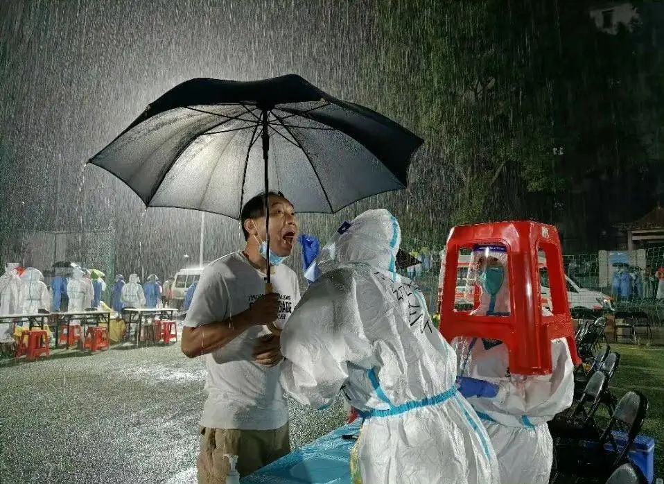 但是做核酸采样的市民没有离开,反而撑起伞,护住了为他采样的医务人员。