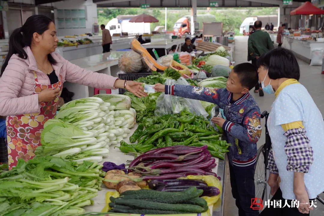 妈妈负责挑好菜,周宗松负责从钱包里掏出钱交给摊主。